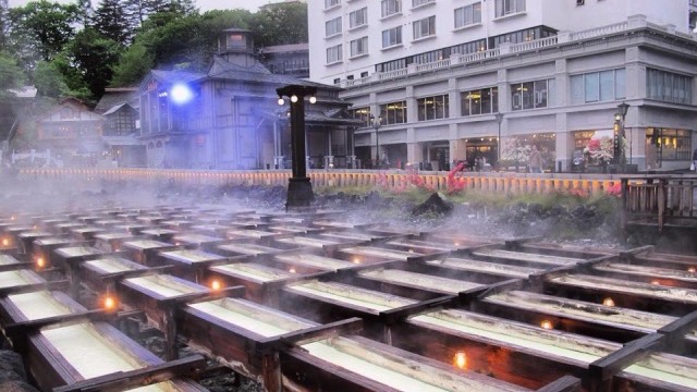 草津町は関東地方の群馬県にあり、温泉街で知られています。町の中心部に湯畑源泉があり、湧き出る温泉水から湯気が立ち昇ります。