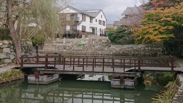 八幡堀に浮かぶ浮橋。ゆれるのでゆっくり気を付けて渡りましょう!