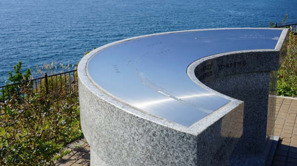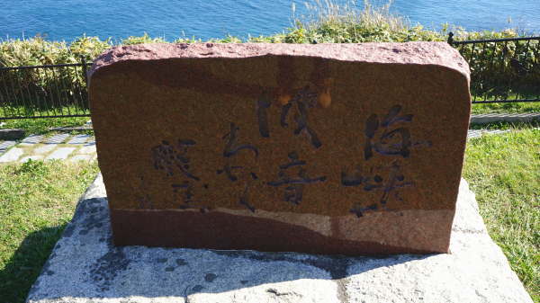 津軽海峡を望む位置に置かれた方位図、青森県の竜飛岬などが記されています。