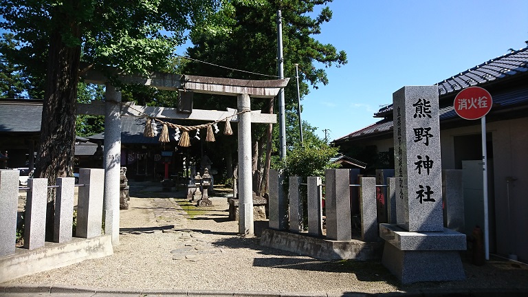 熊野神社と刻まれた石柱の横に建つ白い石造りの鳥居