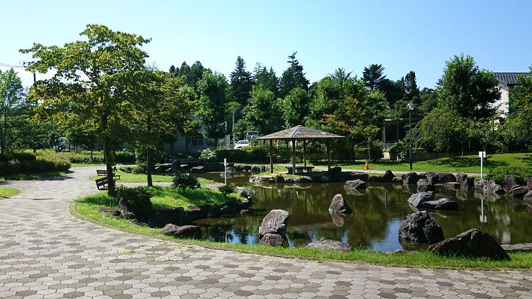 池を中心に水辺の散策が楽しめる公園。広めの駐車場もあり街歩きの起点にもなっています