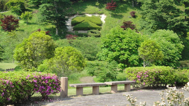 季節の花と公園のベンチ