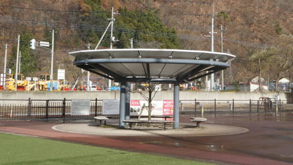 転車台広場の屋根付きのベンチ。SLの方向転換を間近で見ることが出来ます。